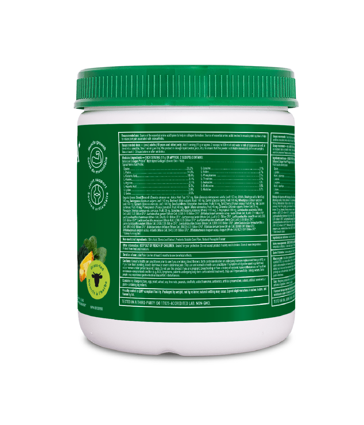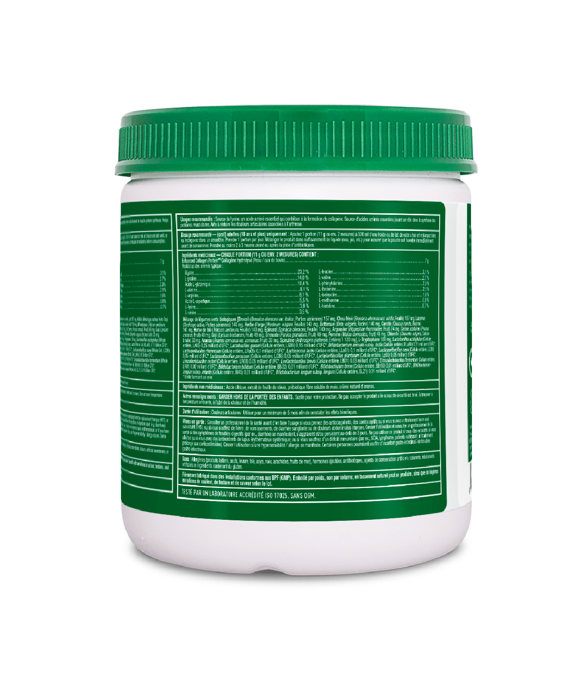 MEDICAL INGREDIENTS: Hydrolyzed Collagen (Bovine Skin/ Hide) 7 g, Broccoli 157 mg, Kale 157 mg, Alfalfa 140 mg, Barleygrass 140 mg, Beetroot 140 mg, Carrot 140 mg, Wheatgrass 140 mg, Spinach 140 mg, Sea Buckthorn 74 mg, Tart Cherry 49 mg, Goji 49 mg, Pomegranate 49 mg, Apple 49 mg, Chlorella 33 mg, Pineapple 33 mg, Spirulina 1120 mg, L-Tryptophan 100 mg, Lactobacillus acidophilus 0.25 Billion CFU*, Lactobacillus gasseri 0.15 Billion CFU*, Bifidobacterium animalis subsp. lactis 0.11 Billion CFU*, Lacticaseibacillus rhamnosus 0.1 Billion CFU*, Lactococcus lactis 0.1 Billion CFU*, Lacticaseibacillus casei 0.05 Billion CFU*, Lacticaseibacillus paracasei 0.05 Billion CFU*, Lactiplantibacillus plantarum 0.05 Billion CFU*, Limosilactobacillus reuteri 0.05 Billion CFU*, Levilactobacillus brevis 0.03 Billion CFU*, Limosilactobacillus fermentum 0.02 Billion CFU*, Bifidobacterium bifidum 0.01 Billion CFU*, Bifidobacterium breve 0.01 Billion CFU*, Bifidobacterium longum subsp. infantis 0.01 Billion CFU*, Bifidobacterium longum subsp. longum 0.01 Billion CFU*. *Colony Forming Unit